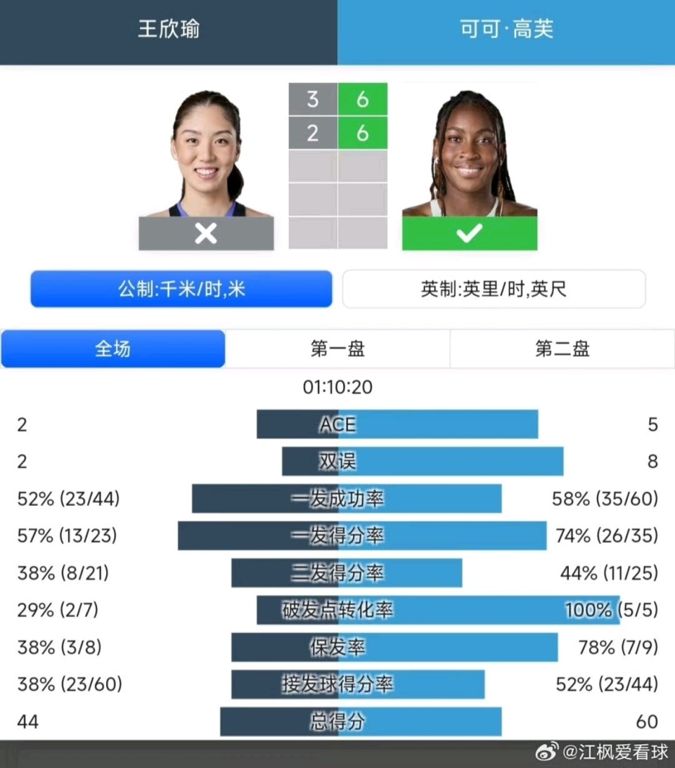 第二盘,高芙已经完全掌控比赛的节奏,2次破发之后,6-2锁定胜局,大比分2-0淘汰王欣瑜,完成复仇。